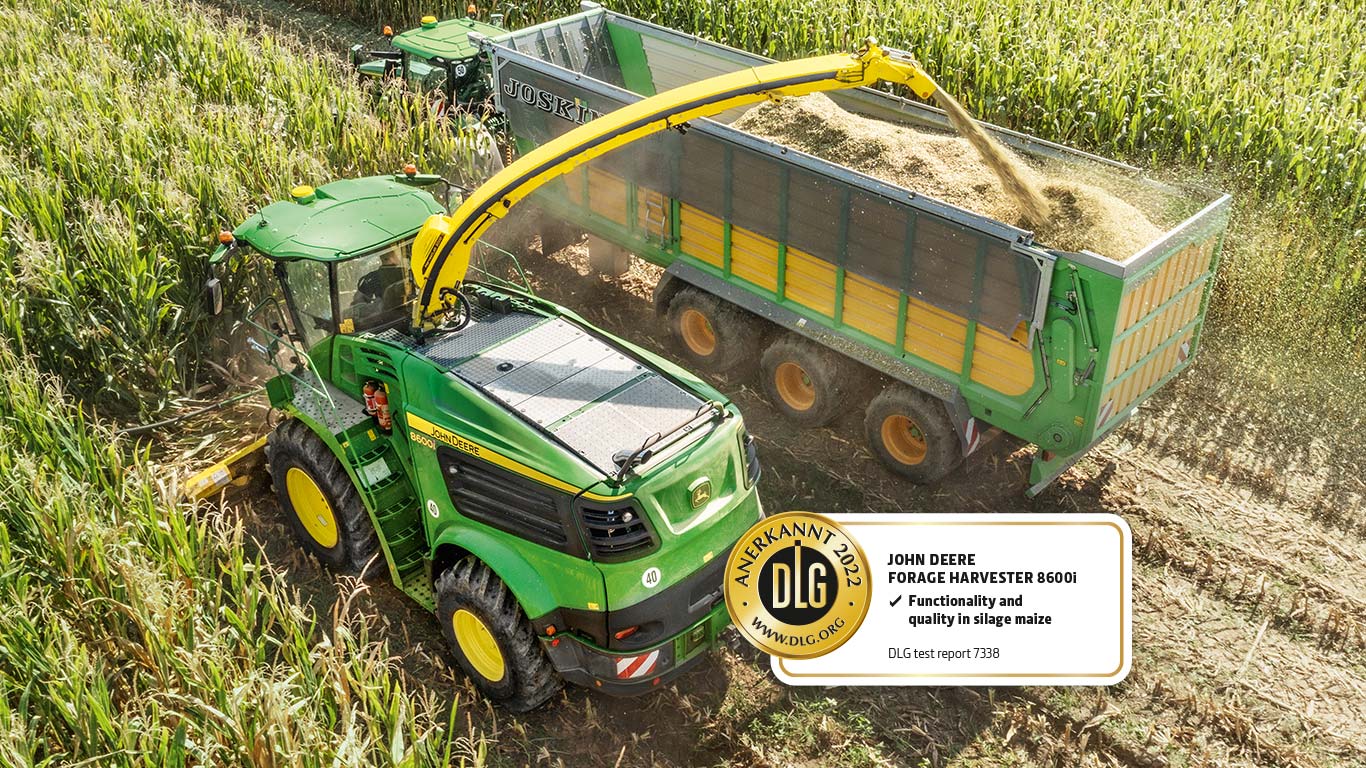 John Deere 8600i nagrađen je značkom “DLG approved” za “funkcionalnost i kvalitetu u silažnom kukuruzu”, što službeno potvrđuje njegove izvrsne performanse na tri različite duljine usitnjavanja.