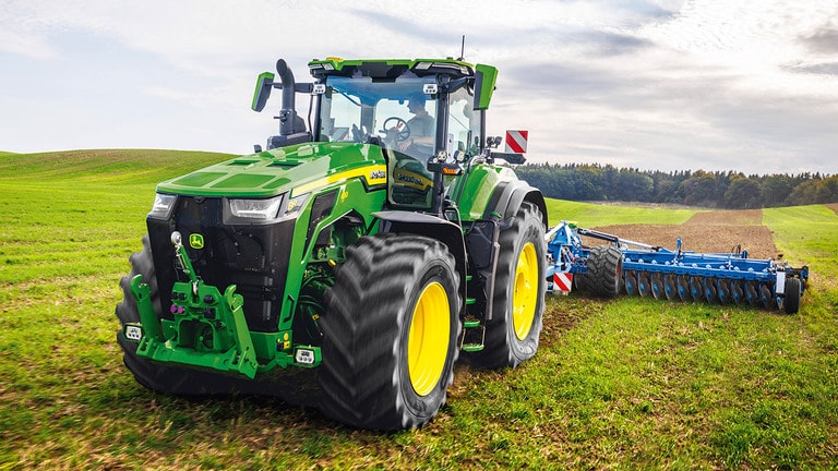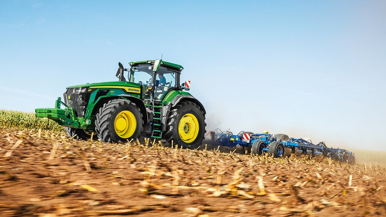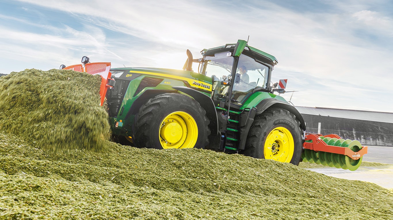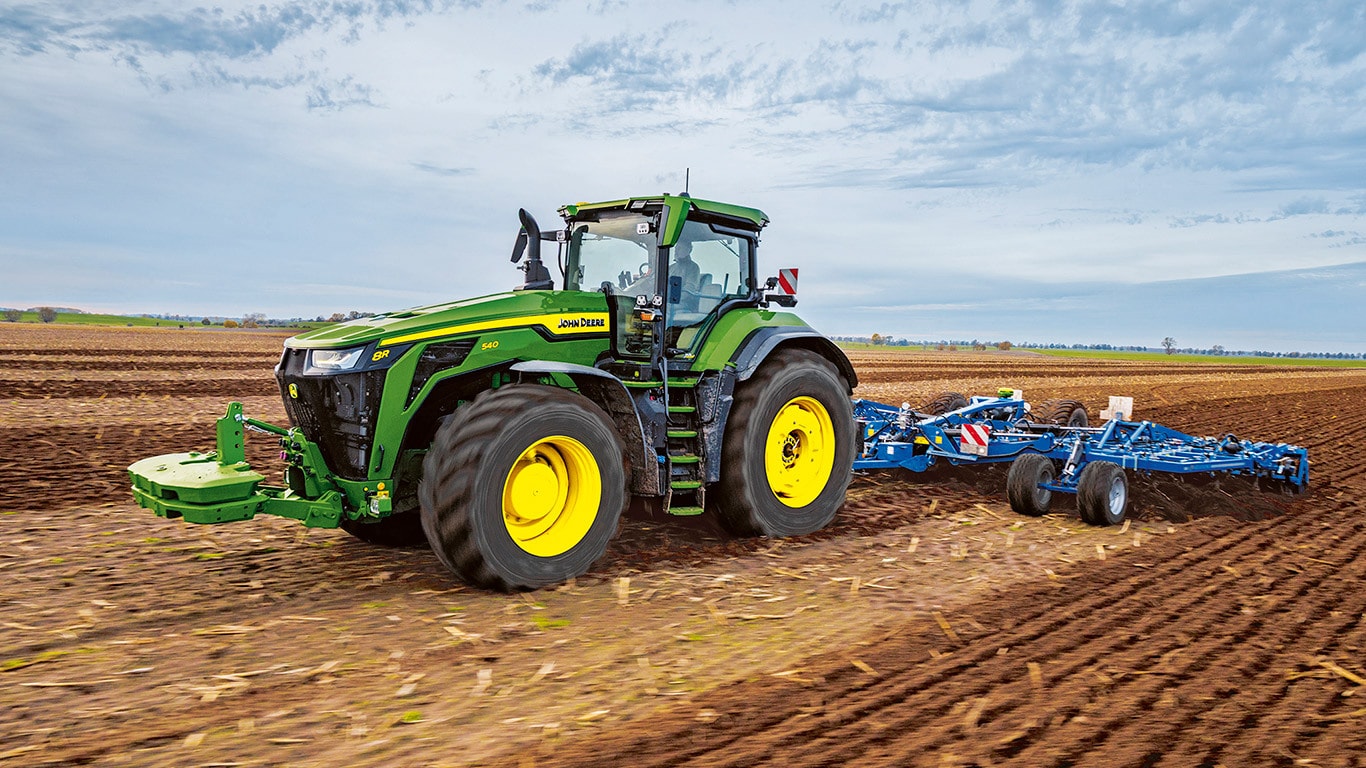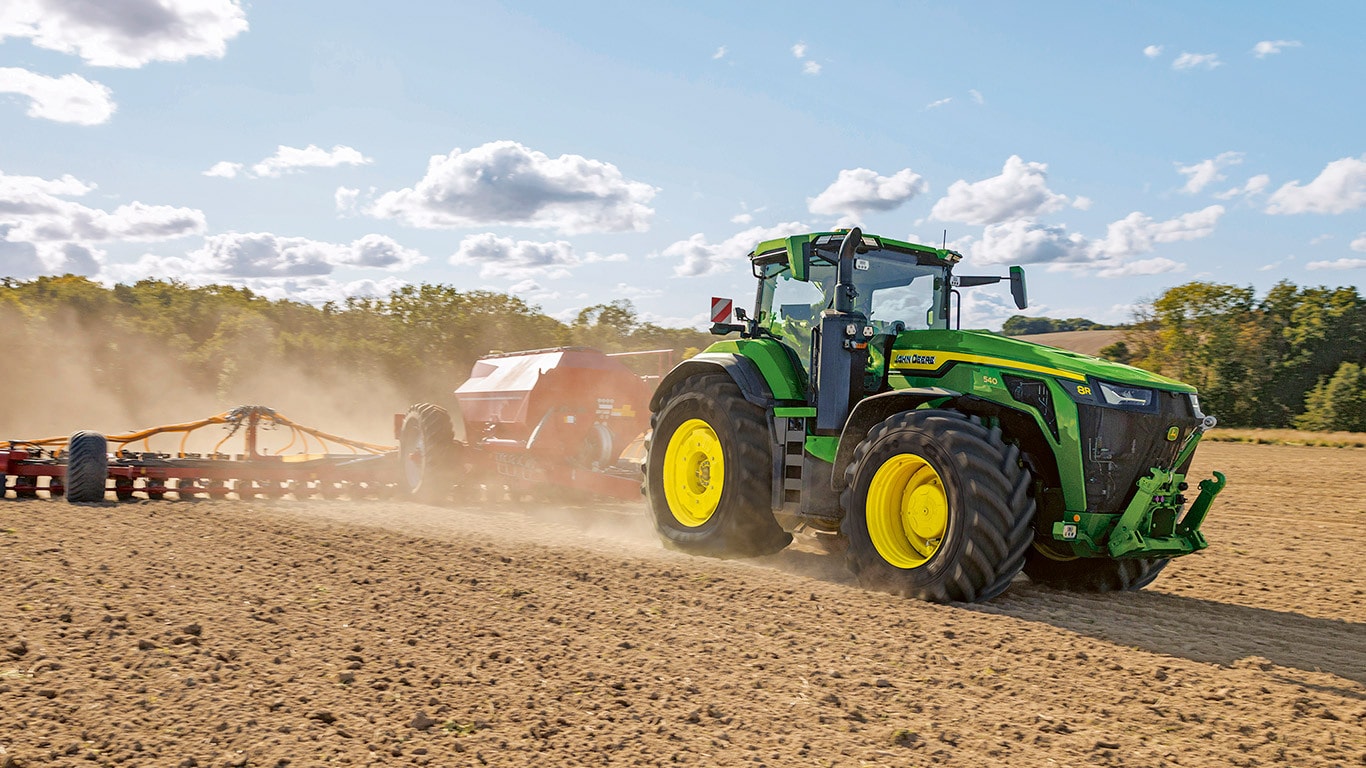Novi traktori 8R High Horsepower pružaju vučnu snagu koja vam je potrebna za najtežu priključnu opremu. S IPM-om vršne snage, motor JD14 pruža do 634 KS točno kada je to potrebno za vrhunsku produktivnost u bilo kojem stanju. Jedinstveni eAutoPowr™ pruža ubrzanje beskonačnim prijenosom i do 8 % bolji prijenos snage u usporedbi sa standardnim hidromehaničkim beskonačnim prijenosima*. Novi 8R High Horsepower posjeduje stražnje gume do 2,30 m, prednje gume do 1,85 m i jednocjevni središnji sustav napuhavanja guma za vrhunsku zaštitu tla, prijenos snage i svestranost.